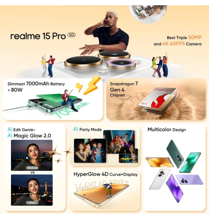 Realme 15 Pro 5g में company ने नया Snapdragon 7 Gen 4 प्रोसेसर दिया है जो न सिर्फ स्मूद परफॉर्मेंस देगा बल्कि Gaming मल्टीटास्किंग को भी कॉफी हद तक बेहतर बनाता हैं