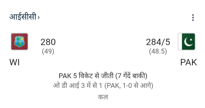 पाकिस्तान के खिलाड़ी ने बहुत ही शानदार खेल खेला पाकिस्तान ने बहुत ही अच्छा स्कोर बनाया था और पाकिस्तान ने 5 विकेट से मैच जीत लिया वेस्टइंडीज का स्कोर 280(49) और पाकिस्तान का स्कोर 284/5(48.5) था इस प्रकार पाकिस्तान ने मैच जीत लिया था